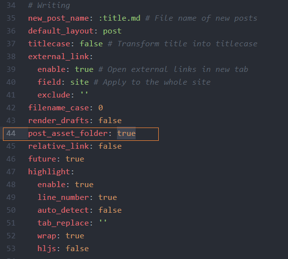 a) 找到_config.yml文件将其中writting部分的post_asset_folder值更改为true。